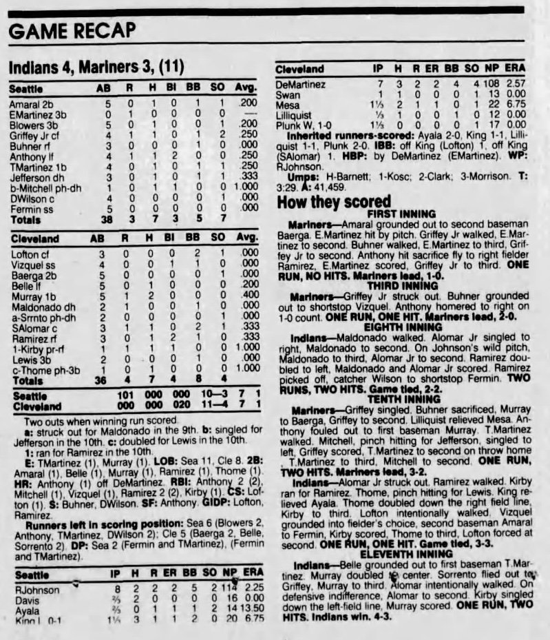 Indians beat Mariners 4-3 in 11 innings on Wayne Kirby 2-out single