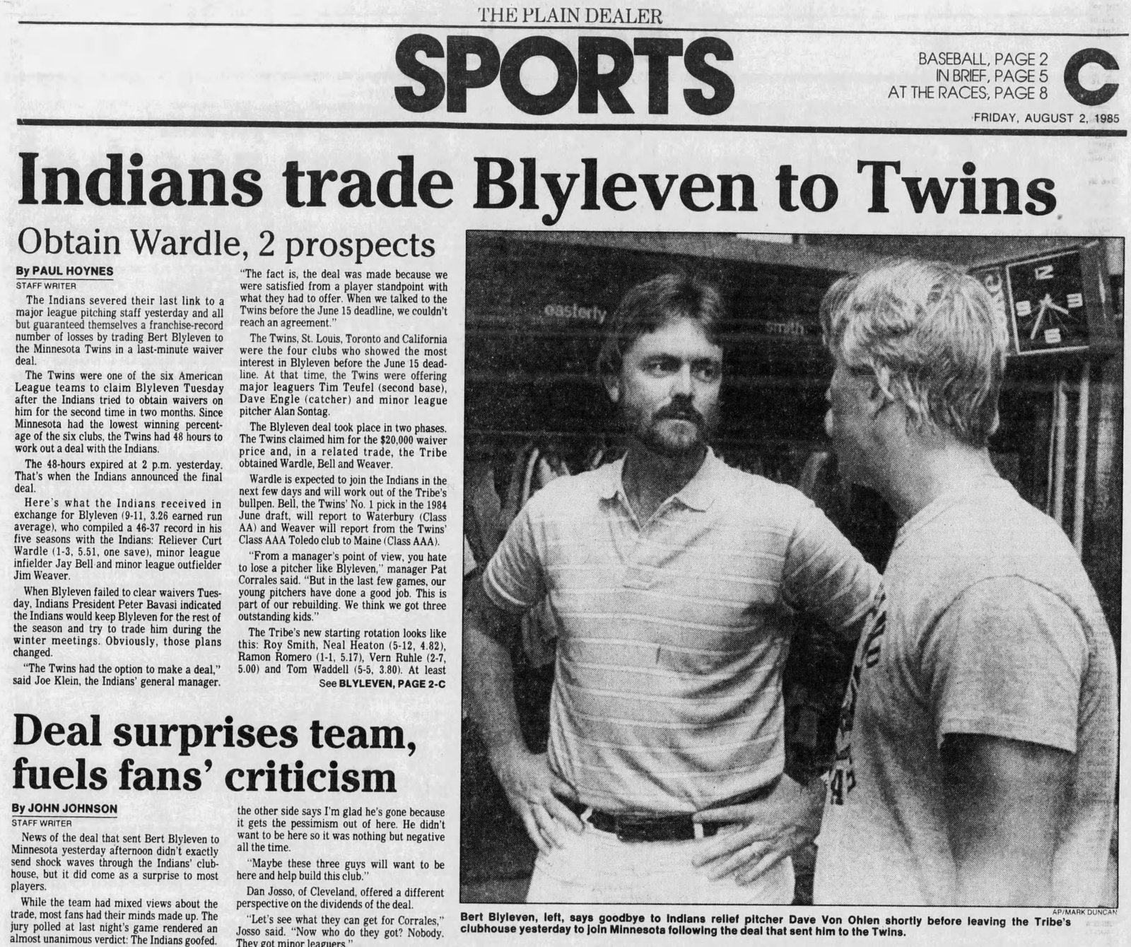 Struggling Indians trade vet Bert Blyleven (3rd in ’83 Cy Young vote) to Twins