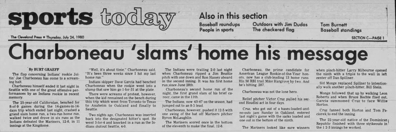 Cleveland rookie sensation Joe Charboneau hits his 1st career Grand Slam