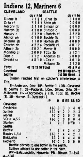 He goes 2 for 4 with 2 HRs/6 RBIs in Tribe comeback win vs. Mariners