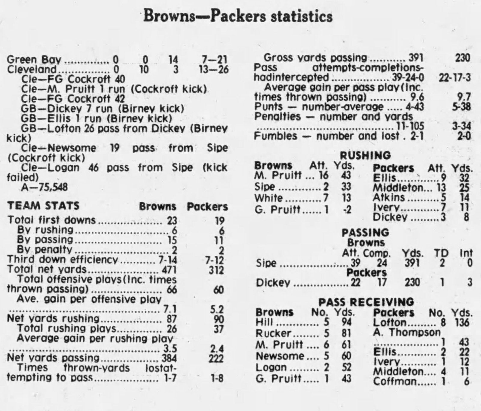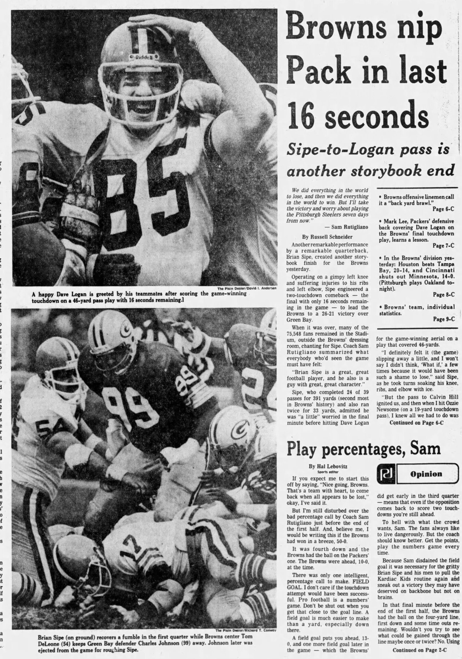 Brian Sipe to Dave Logan for 46-yd TD w/ :16 secs left for win